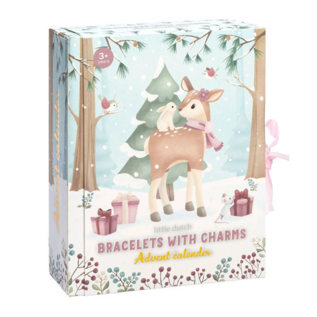 Little Dutch Calendario Avvento 2025 contiene 4 braccialetti, 27 charms e 20 adesivi da scoprire ogni giorno.