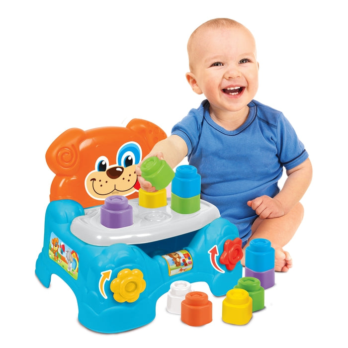Le divertenti attività interattive poste alla base della poltroncina aiutano la bambina a sviluppare la manualità. La seduta, divertente base di gioco, è solida e accogliente e nasconde un pratico vano contenitore per i mattoncini.
