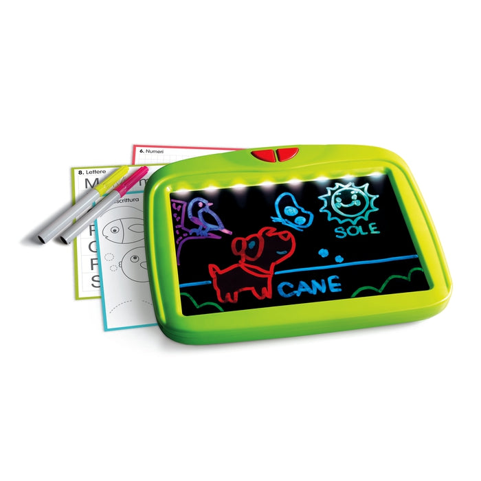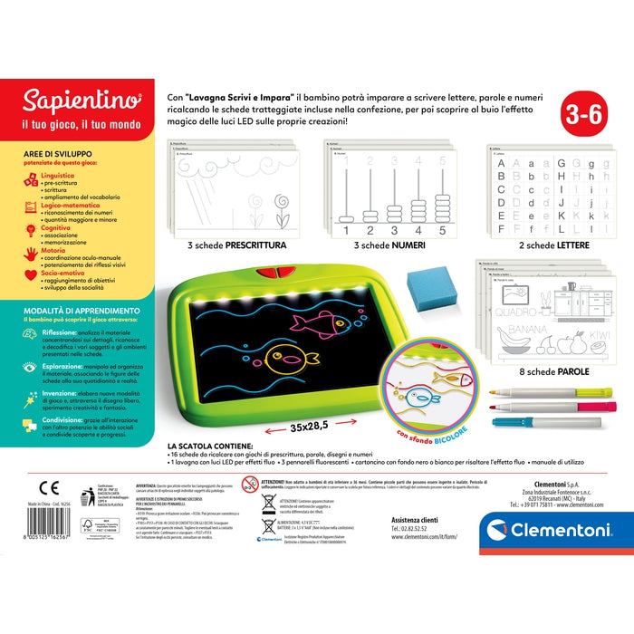 Sapientino Lavagna Scrivi e Impara è un gioco Clementoni composto da una lavagna dotata di un piano trasparente con luci LED RGB e pennarelli fluorescenti per divertirsi a disegnare e approcciarsi alla scrittura.
