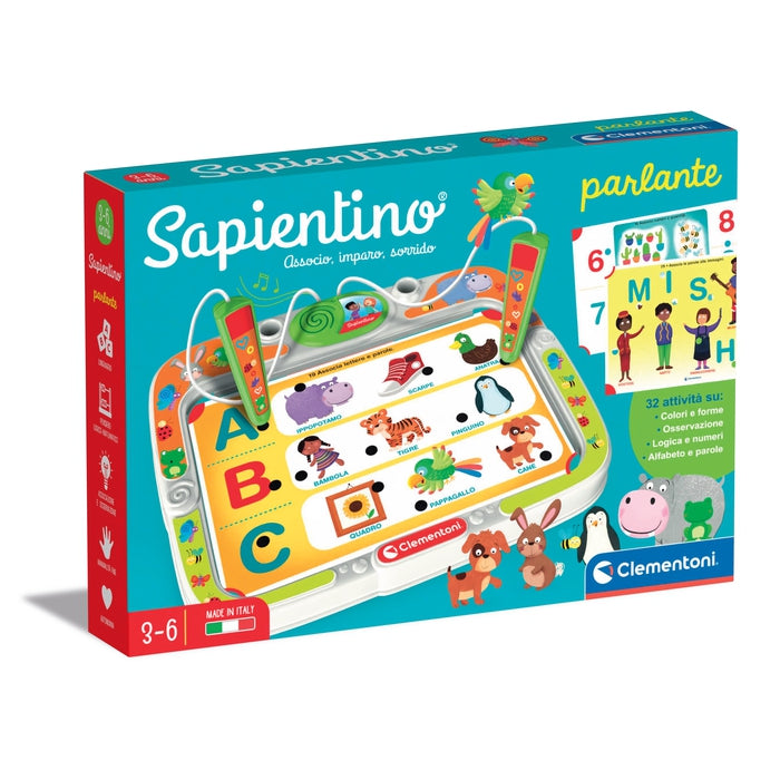 Sapientino Parlante è un gioco educativo Clementoni elettronico. Composto da un banchetto, schede educative e spinotti, il Sapientino è un classico tra i giochi educativi che ha divertito generazioni di bambini.