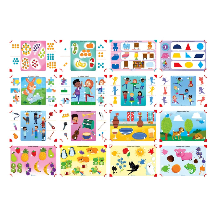 Le 16 schede educative con 32 attività propongono un programma di domande a difficoltà che tocca tutti i temi tipici dell’età prescolare. Il bambino risponde alle domande collegando due immagini attraverso le penne elettroniche che lo avvisano con una simpatica frase in caso di associazione corretta.