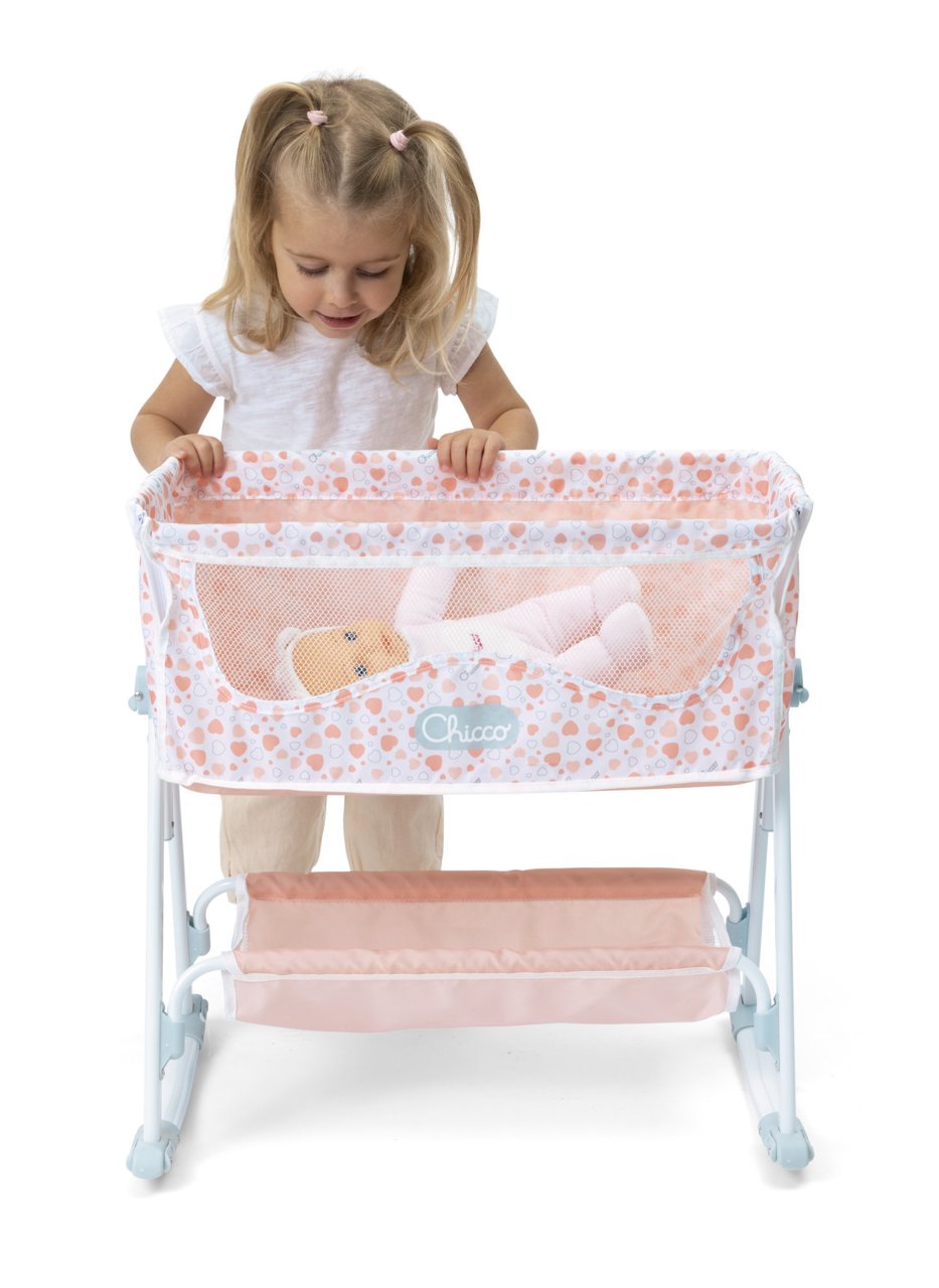 Culla realistica per bambole, ispirata all’iconica Chicco Next2Me. Facile da montare e ideale per un gioco interattivo.