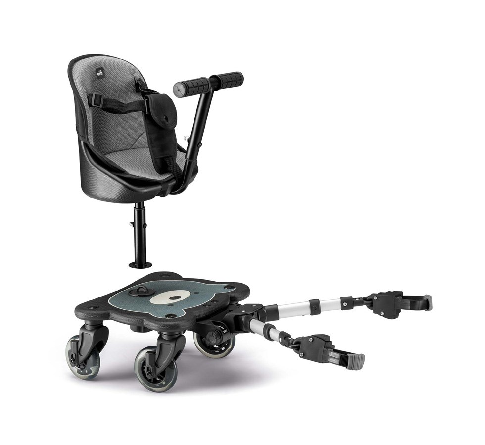 La seduta è facilmente rimovibile, permettendo ai bimbi più grandi di stare in piedi sulla pedana a forma di orsetto. Ha 4 ruote, di cui 2 luminose per utilizzo notturno. Gli adattatori telescopici permettono il fissaggio universale su qualsiasi passeggino.
