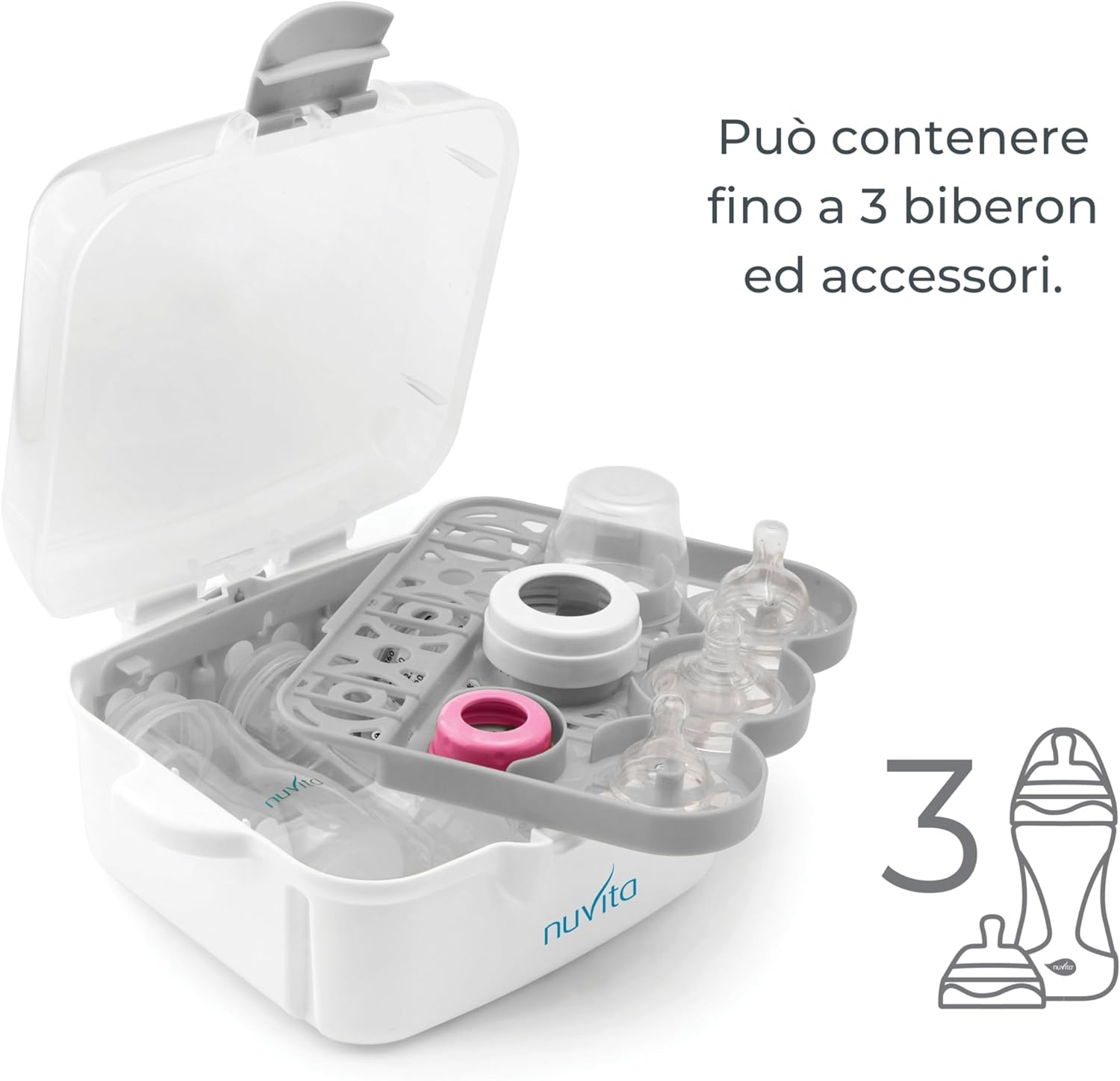 • Compatto e Leggero: Ideale per l’uso quotidiano e per viaggiare, il design compatto e leggero rende facile riporlo e trasportarlo, assicurando che tu possa mantenere gli accessori del tuo bambino sterilizzati ovunque tu vada.