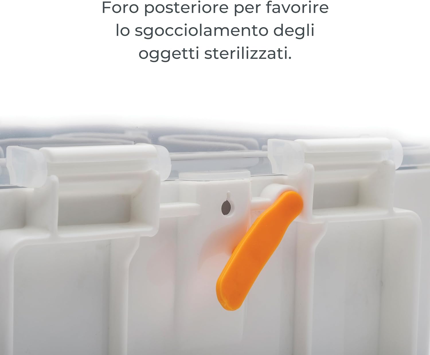 • Ampia Capacità: Capace di contenere vari oggetti contemporaneamente, lo sterilizzatore è ideale per trattare biberon, tettarelle, succhietti e piccoli giocattoli, risparmiando tempo e energia.